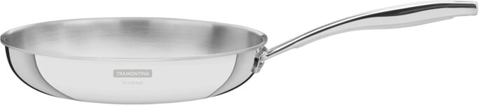 Features triple layer construction with stainless steel, aluminum, and stainless steel for even heat distribution.
